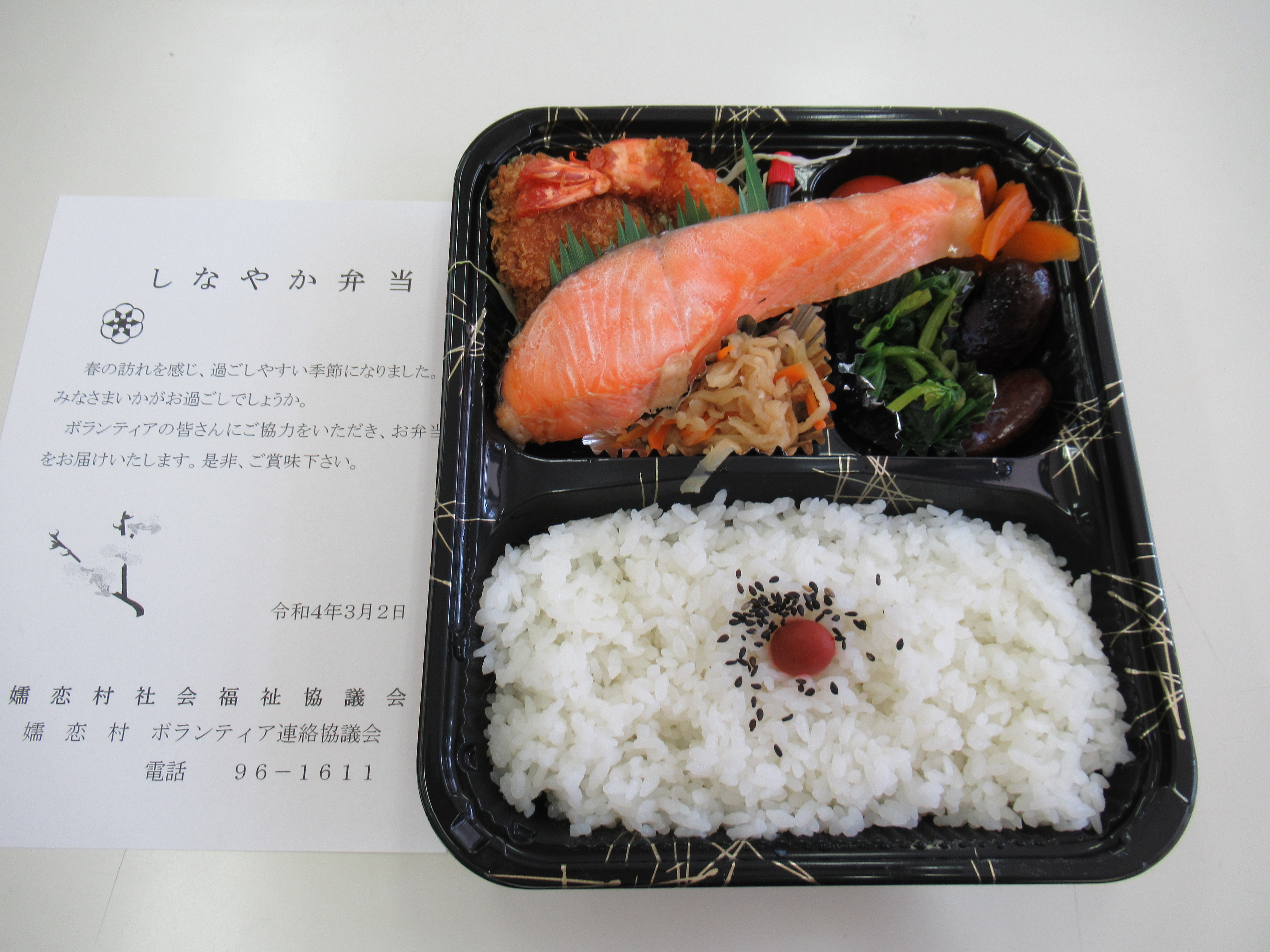 3月2日(水)に、今年度第2回目の80歳以上一人暮らしの方への配食サービスが行われました。今回は、新型コロナウイルス感染症対策のため、村内にある業者にお弁当を依頼し、ボランティアの方にお届けをしていただきました。お届けをした方からは「いつもありがとう」「楽しみにしていました」とのお言葉をいただきました。来年度も、お楽しみにお待ちください。