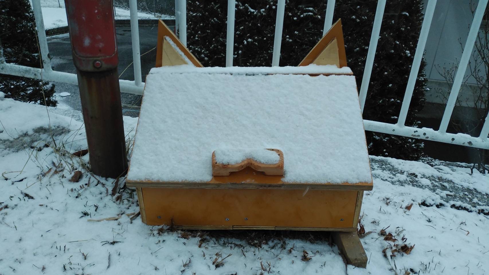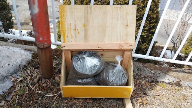社協の敷地内に役場建設課が作ってくれた猫型の箱があります。これは何だと思いますか??滑り止め用の砂が入っています。今年度は、雪も多く路面が滑りやすかったため大活躍しました。