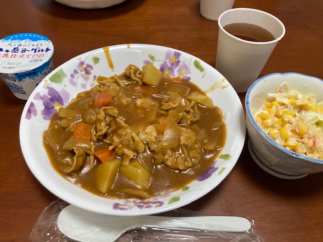 <今回のメニュー:チーズカレーライス、キャベツとカニカマのサラダ、ヨーグルト>