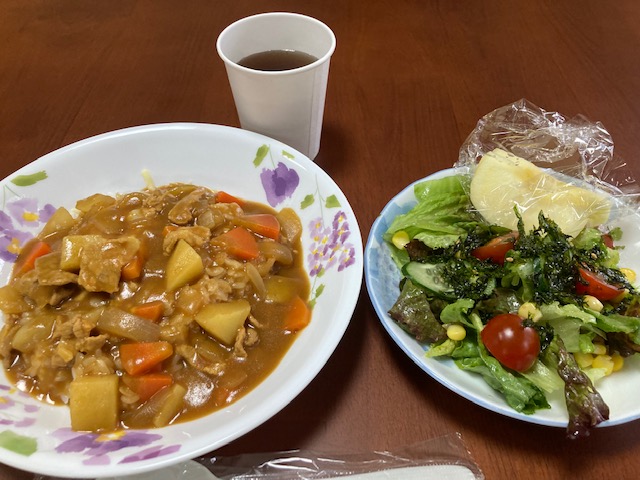 <メニュー:チーズカレーライス、チョレギサラダ、リンゴ>