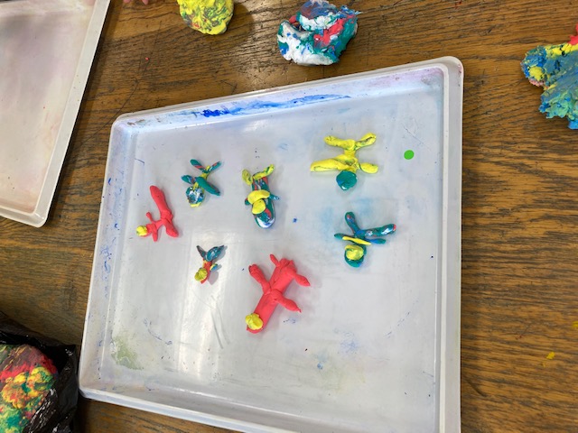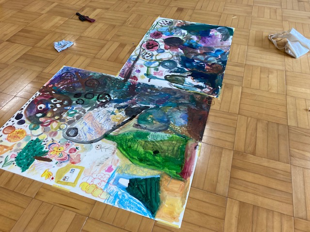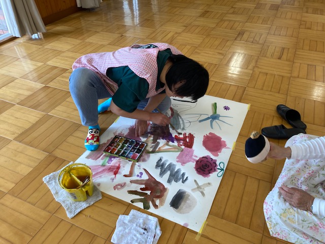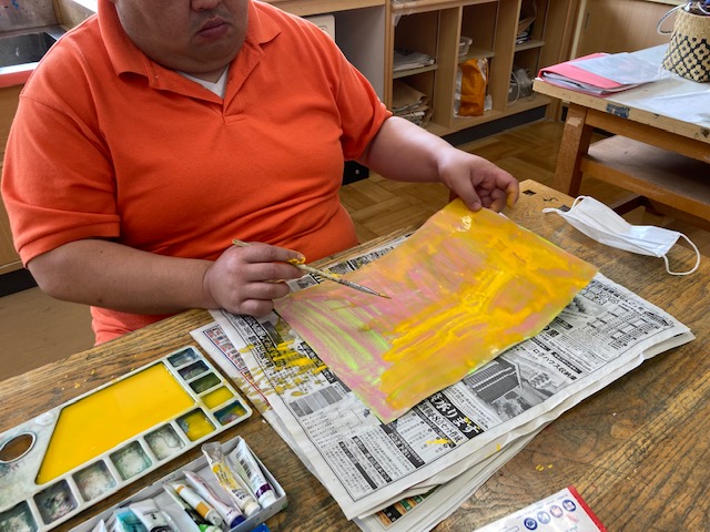 アトリエもくは、月に1回、知的障害者の余暇活動として、絵画や書道など自由なアート活動を行っています。今月のテーマは「絵の具」です。大きな紙に、思いおもいの絵を描いて、素敵な作品ができました。その他にも、書道をしたり、粘土でたくさんの飛行機を作ったりと、短い時間でしたが、集中して作品と向き合っていました。