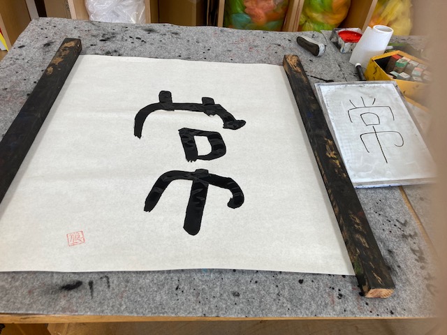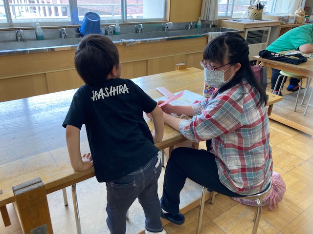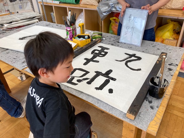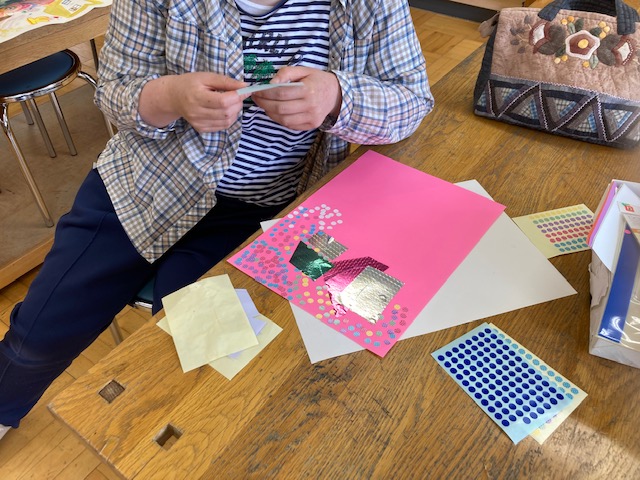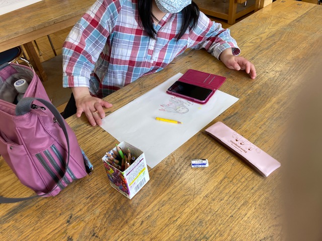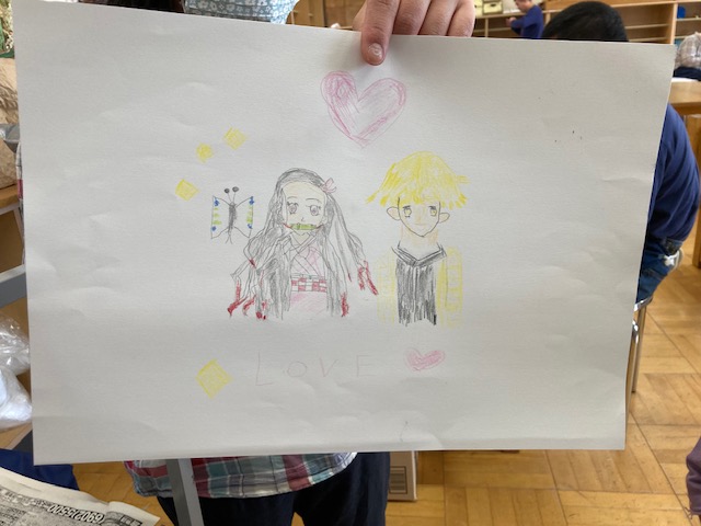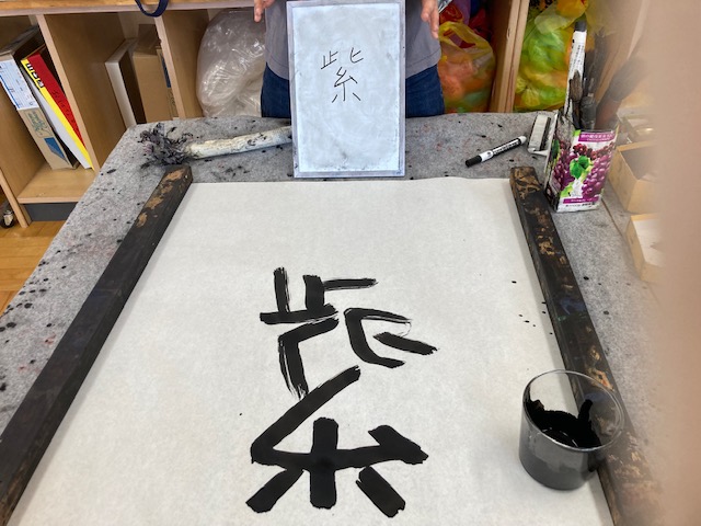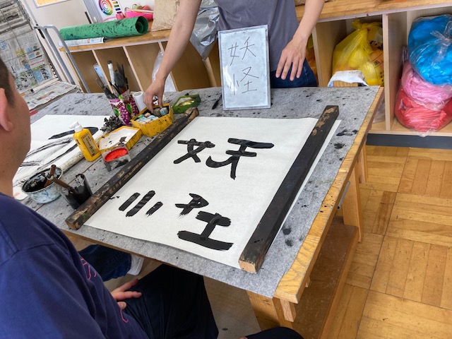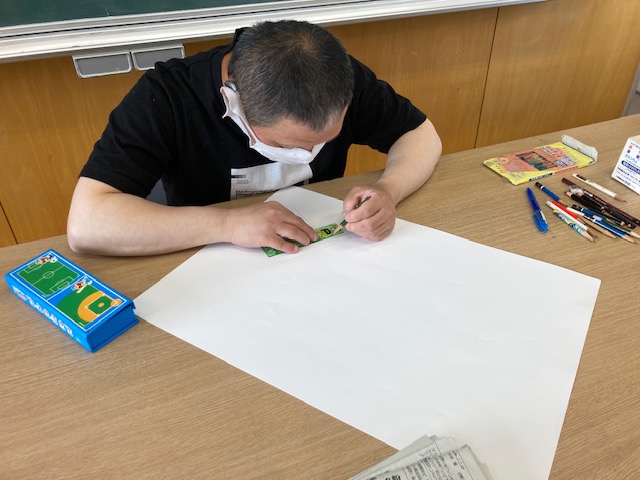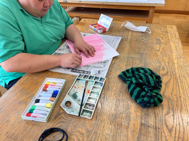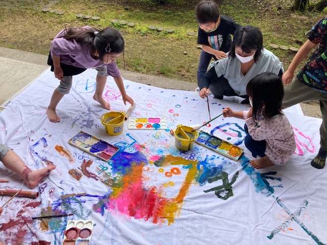 アトリエもくは、月に1回、知的障害者の余暇活動として、絵画や書道など自由なアート活動を行っています。今月のテーマは「大きな布」です。外で、大きな布に、思いおもいの絵を描きました。室内では、書を書いたり、好きなアニメの絵を描きました。