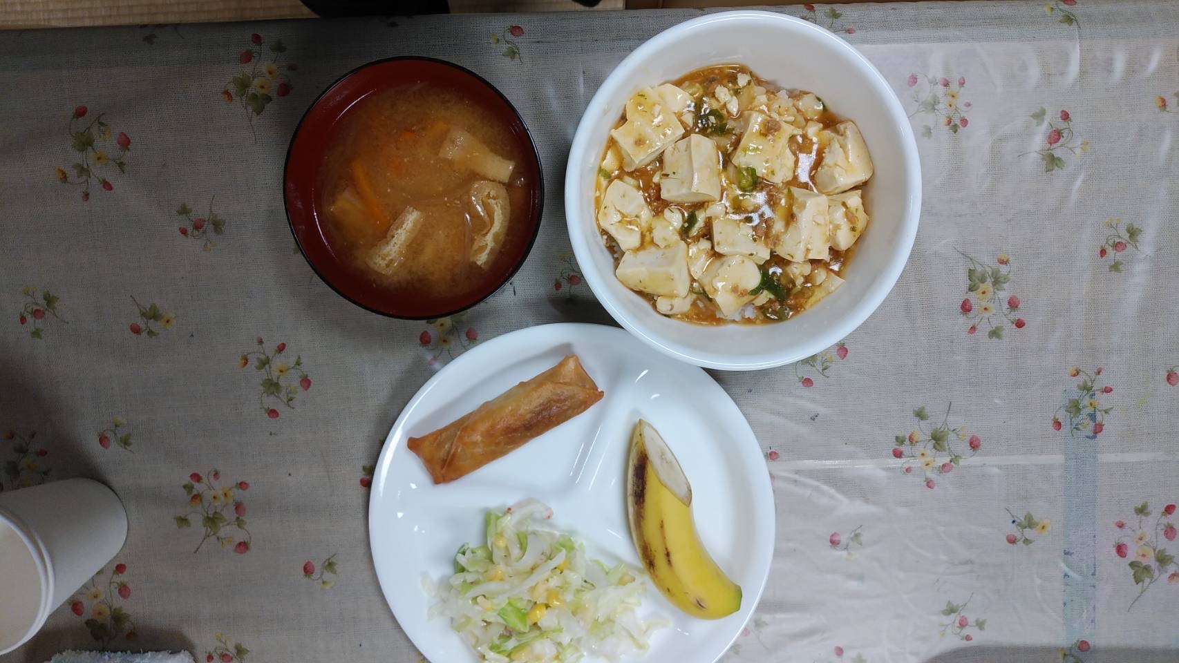 <14日メニュー:麻婆豆腐丼、おみそ汁、みまつ食品様から春巻き、サラダ、バナナ>