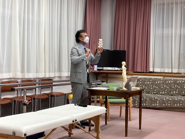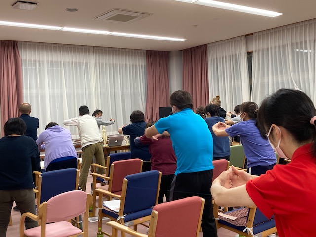 9月30日、業務終了後に職員全体研修を行いました。講師にかつきはりきゅう治療院禾木秀利先生をお招きし、実技と講習を交えた腰痛予防講習会を行っていただきました。正しい知識とちょっとした運動で腰痛を予防できるとのことです。毎日続けられるトレーニングも教えていただきましたので、続けていきたいです。
