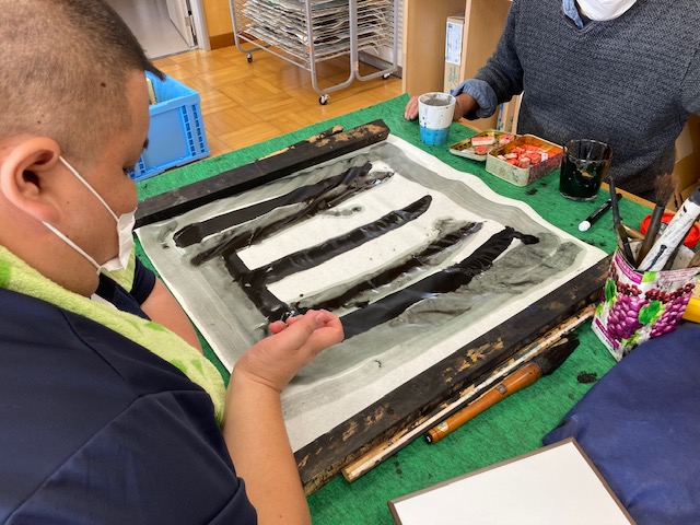 アトリエもくは、月に1回、知的障害者の余暇活動として、絵画や書道など自由なアート活動を行っています。今月のテーマは「ハロウィン」です。袋に、シールや紙を貼ったり、好きな色をつけたり衣装を作りました。素敵な衣装が出来上がりました。