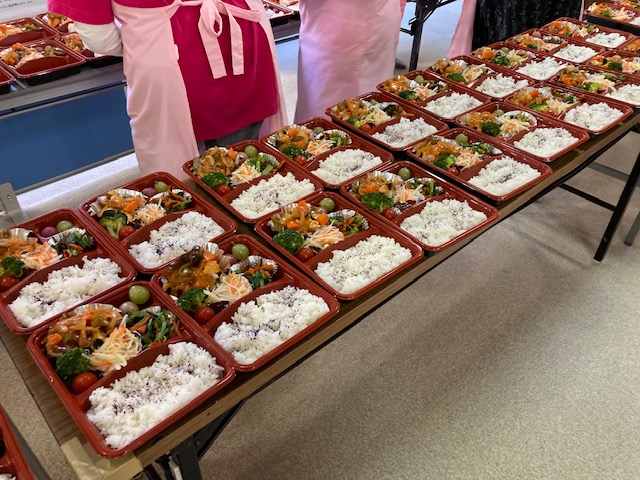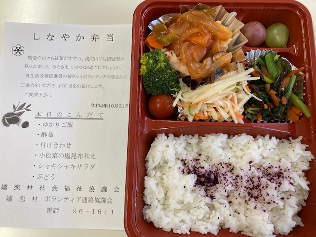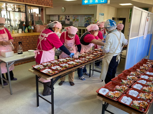 10月31日に、今年度第1回目の80歳以上一人暮らしの方への配食サービスが行われました。130食を食生活改善推進委員の皆さんにお弁当を作っていただき、ボランティアの方にお届けをしていただきました。