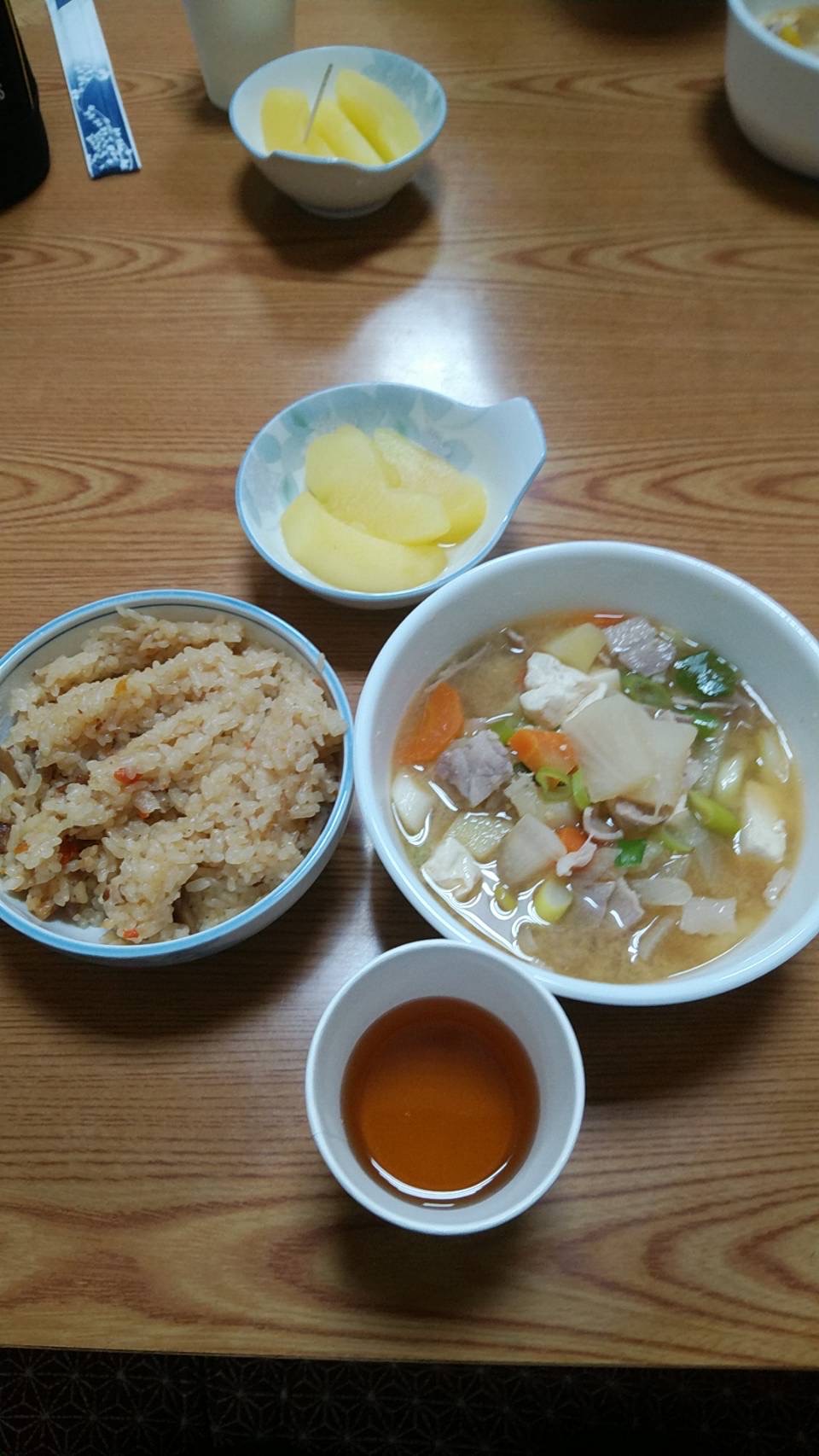 <14日メニュー:豚汁、炊き込みご飯、煮りんご>