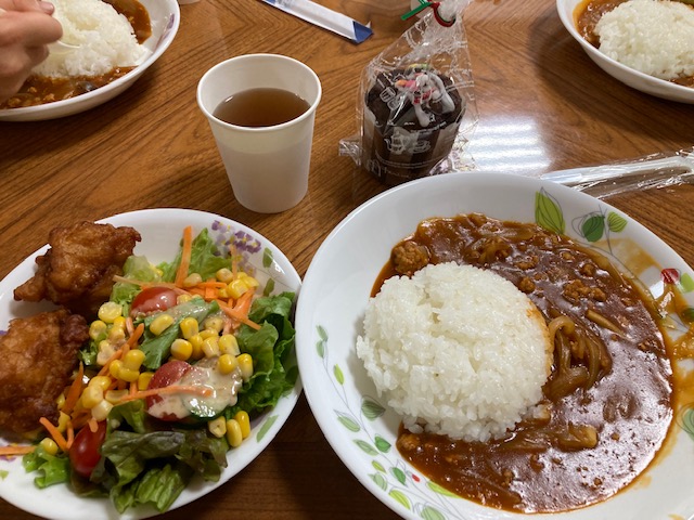 <21日メニュー:ハヤシライス、唐揚げ、サラダ、ピギーズカフェさんのマフィン>