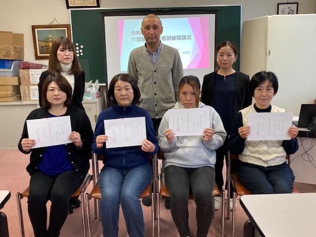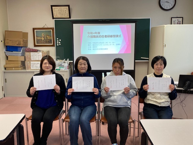 10月11日(火)から始まりました介護職員初任者研修が、130時間に及ぶ講習を終え、12月22日(木)に閉講式を行いました。皆さん晴れ晴れとした顔で修了証書を受け取っていました。受講生からは「嬬恋村内で研修を受講できて大変良かった。」や「早速、家族のことで役に立った」などの声をいただきました。これからは、地域やご家族のためにご活躍をしていただきたいと思います。受講生の皆さん、講師の皆さん大変お疲れ様でした。