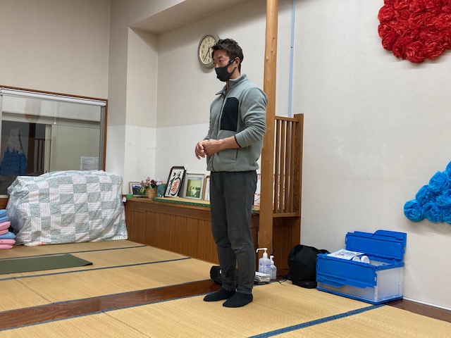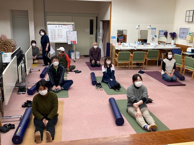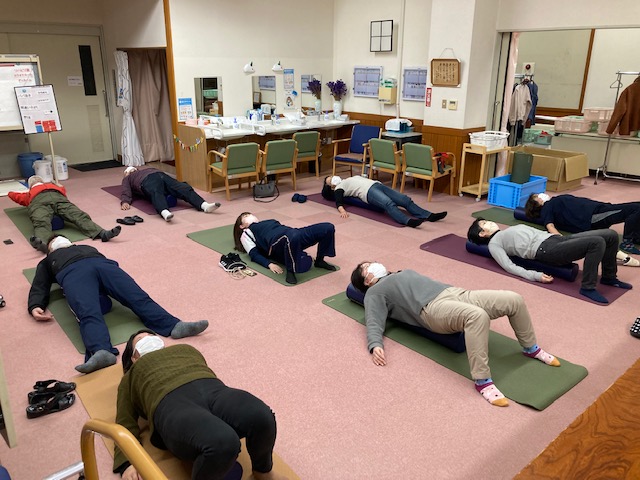 1月12日より毎週木曜日に、嬬恋村役場未来創造課の大八木さんをお招きし、勤務終了後に運動教室を開催していただいています。2回目は14名の参加がありました。今回は、ストレッチポールを使い、体のコンディションを整えたり、筋膜リリースを行いました。筋膜リリースは、かなり痛く、参加者は悲鳴を上げながらストレッチポールと戦っていました。筋膜が緩んだ後は、足がスムーズに上がるようになったので、とても痛かったですが、お風呂上りなどに行うとより効果的との事でしたので、家でもしてみようと思います。