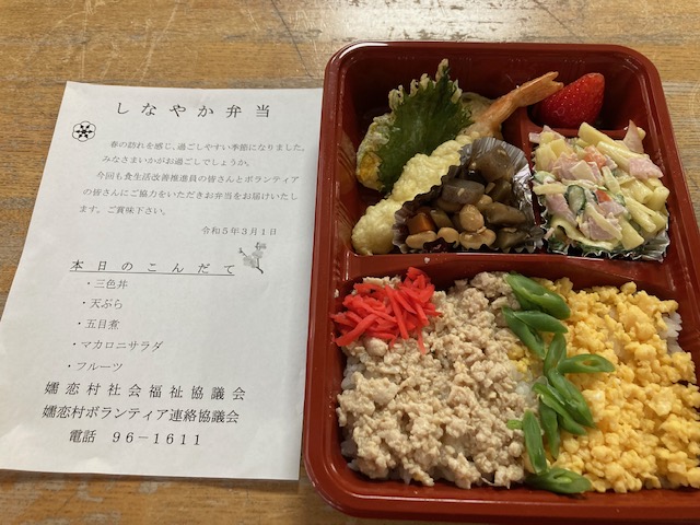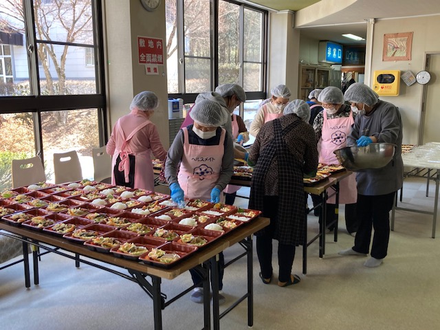 3月1日に、今年度第3回目の80歳以上一人暮らしの方への配食サービスが行われました。120食を食生活改善推進委員の皆さんにお弁当を作っていただき、ボランティアの方にお届けをしていただきました。お届けをした方から「楽しみに待っていました。」と嬉しいお言葉をいただきました。来年も引き続き行っていく予定ですので、楽しみにしていてください。