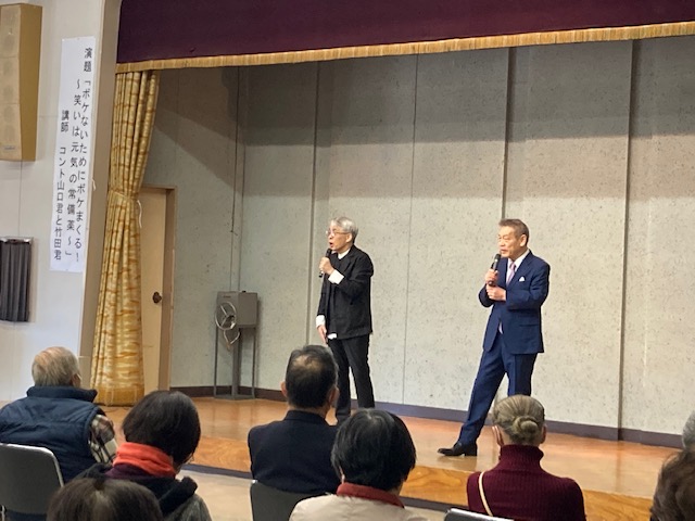 3月6日(月)、13時30分より嬬恋会館にて、講師にコント山口君と竹田君をお招きし『ボケないためにボケまくる!~笑いは元気の常備薬~』と題し講演を行っていただきました。200名近い方にお越しいただき、1時間30分という時間でしたが、コントもあり、終始笑いの絶えない講演会となりました。参加された方からは、「とても楽しかった、元気になったよ。」と皆さん笑顔でお帰りになっていきました。笑いは元気の常備薬ですね!
