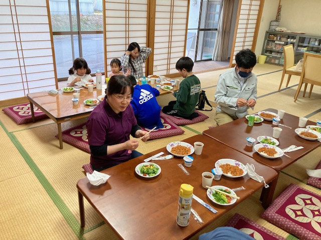 4月12日のみんなの水曜食堂の様子です。新年度初の食堂となりました。中学生になり来られなくなった子どもたちもいますが、新しい参加者も増えました。桜が満開で、子供達は桜をみたり、桜の花びらと格闘したりしていました。今回のメニューはハヤシライスです。水曜食堂のハヤシライスは、鳥の挽肉入り、野菜たっぷりのハヤシライスです。たくさん作ってもらいましたが完食です。ごちそうさまでした。