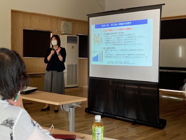 6月12日(月)、令和5年度第2回生活支援体制整備事業協議体【チームちょこっと】の定例会議を行いました。チームちょこっとは「誰もが安心して暮らしていけるむら」をスローガンに、住民・関係機関・行政・社協などで話し合いを行っています。今回は4月に新委員が加わり、原点に返り生活支援体制整備事業について勉強するため、講師に高崎市第1層生活支援コーディネーター目崎智恵子氏をお招きし「~みんなで支え合うまちづくり~生活支援体制整備事業」と題して講演をしていただきました。基本的な話から始まり、各地で行われている取り組みなど事例をだしていただき、委員の皆さんのモチベーションが上がる勉強会となりました。