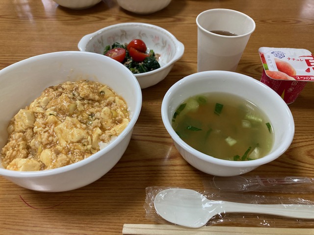 <14日メニュー:麻婆豆腐丼、野菜たっぷり中華風スープ、ほうれん草とツナのサラダ、ヨーグルト>