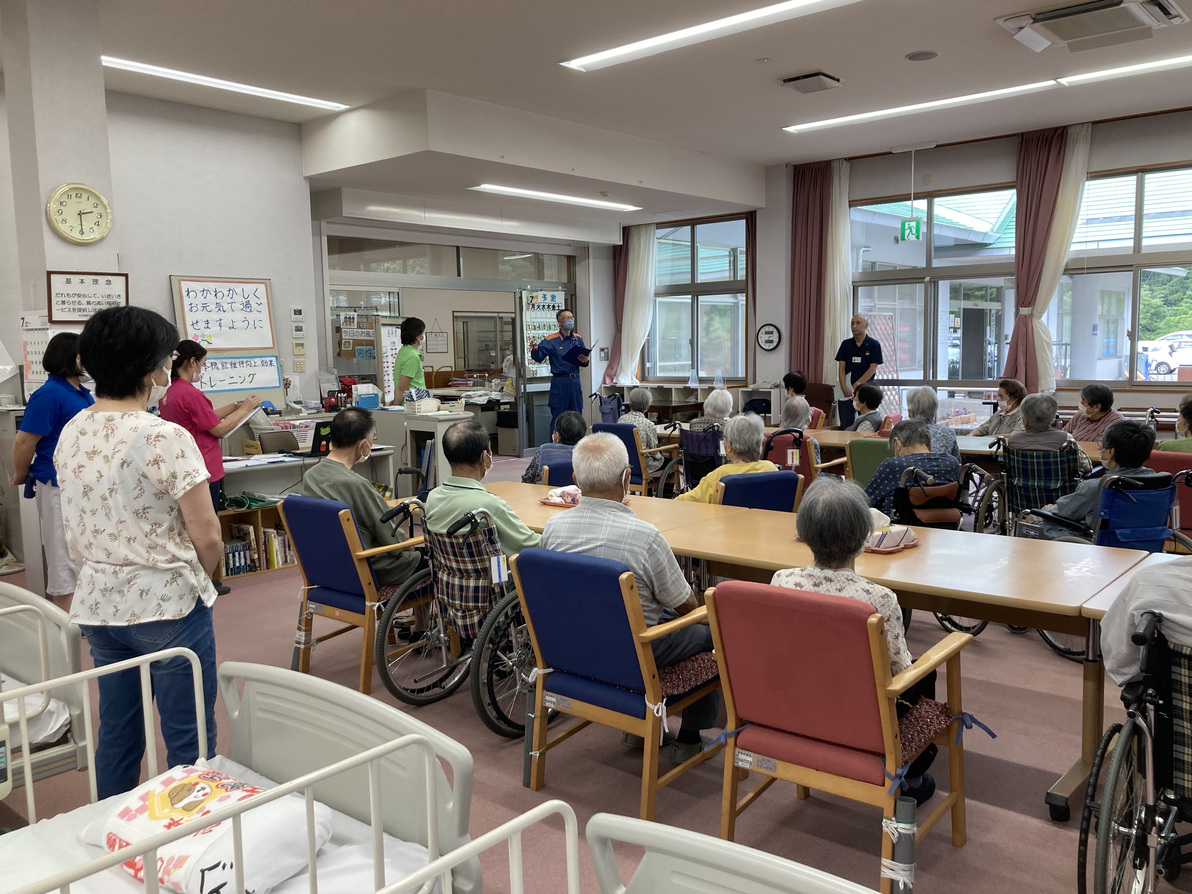 7月31日、デイサービスセンターの火災避難訓練を行いました。利用者様を始め、職員も慌てず、落ち着いて避難ができました。訓練終了後は、消防署長さんより訓練の講評をいただきました。的確に指摘をしていただき大変勉強になりました。日頃から防災意識を大事にしようを改めて思いました。