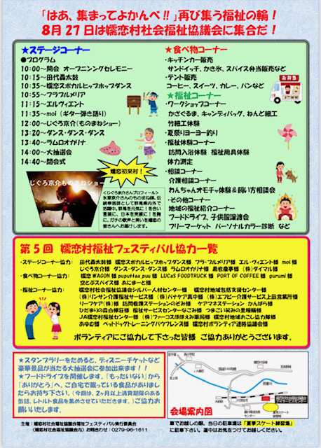 8月27日(日)に、令和5年度第5回福祉フェスティバルを開催します。今回の目玉は、福祉コーナーでは、福祉体験や、ワークショップなど、お子さんから大人まで楽しめるコーナーが盛りだくさんになっています。食べ物コーナーは、嬬恋村内外の、キッチンカーやお店が集結!美味しいものを食べて笑顔になりましょう。ステージコーナーでは、様々な団体の皆さんの公演があります。そして、今回はものまね師じぐろ京介さんが嬬恋村に初来村!ステージ盛り上げます。
