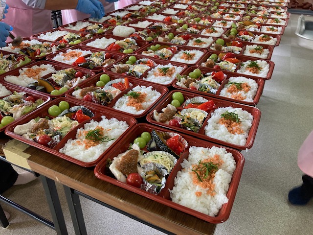 10月5日に、今年度第1回目の80歳以上一人暮らしの方への配食サービスが行われました。126食を食生活改善推進委員の皆さんにお弁当を作っていただき、ボランティアの方にお届けをしていただきました。お届けをした方から「毎年ありがとうございます。楽しみにしていました。」と嬉しいお言葉をいただきました。今年度は、12月と3月の2回となります。お楽しみにお待ちください。