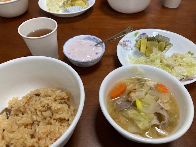 <8日メニュー:炊き込みご飯、豚汁、キャベツサラダ、フルーチェ>