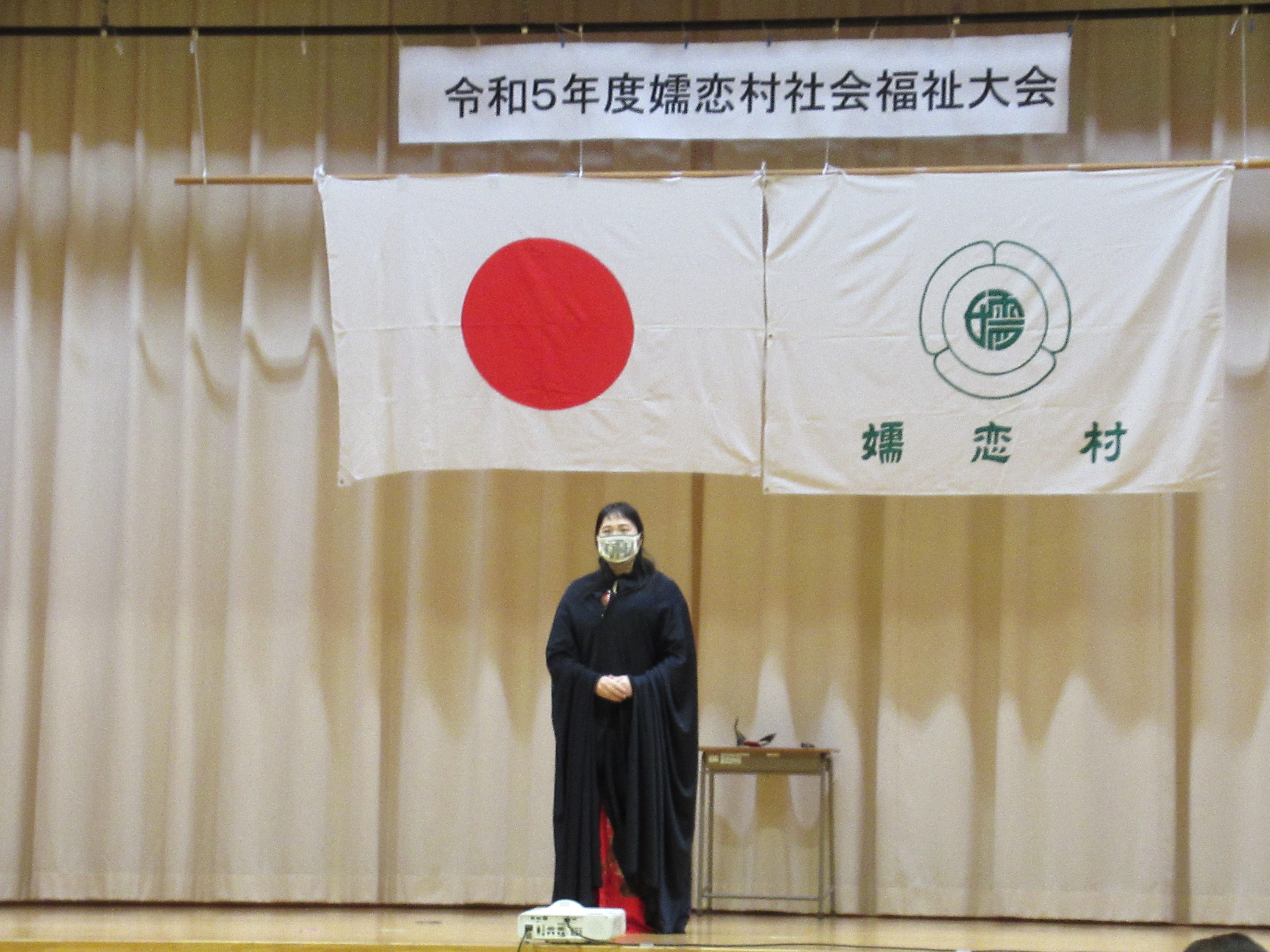 11月11日(土)、嬬恋村立東部小学校体育館にて、令和5年度嬬恋村社会福祉大会が開催されました。第2部は、講演会を行いました。講師に河除静香氏をお招きし、Smiley Tomorrow笑顔の明日へ~「見た目問題」当事者としての人生~と題して、一人芝居と講演を行っていただきました。顔面動静脈奇形という難病で、生まれつき鼻と上口唇に変形があり、見た目問題の当事者として、いじめや差別を受けた話から、幸せな人生を目指して生きていることを話していただきました。講演を聴いた方達からは、「とても良かった。」や「子供たちに話をしてもらいたい。」など様々な感想をいただきました。