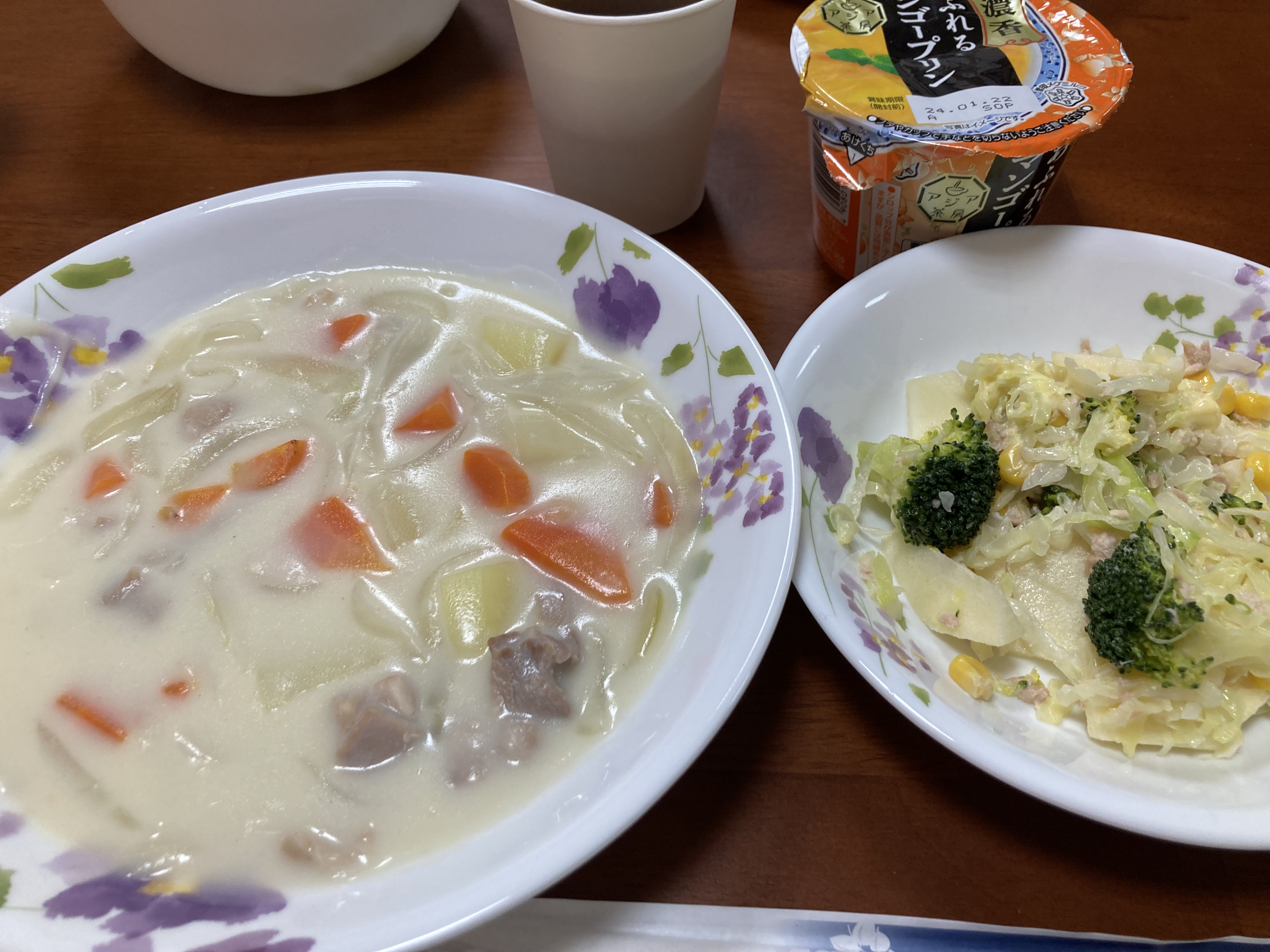 <20日のメニュー:ホワイトシチュー、ご飯、キャベツサラダ、デザート>