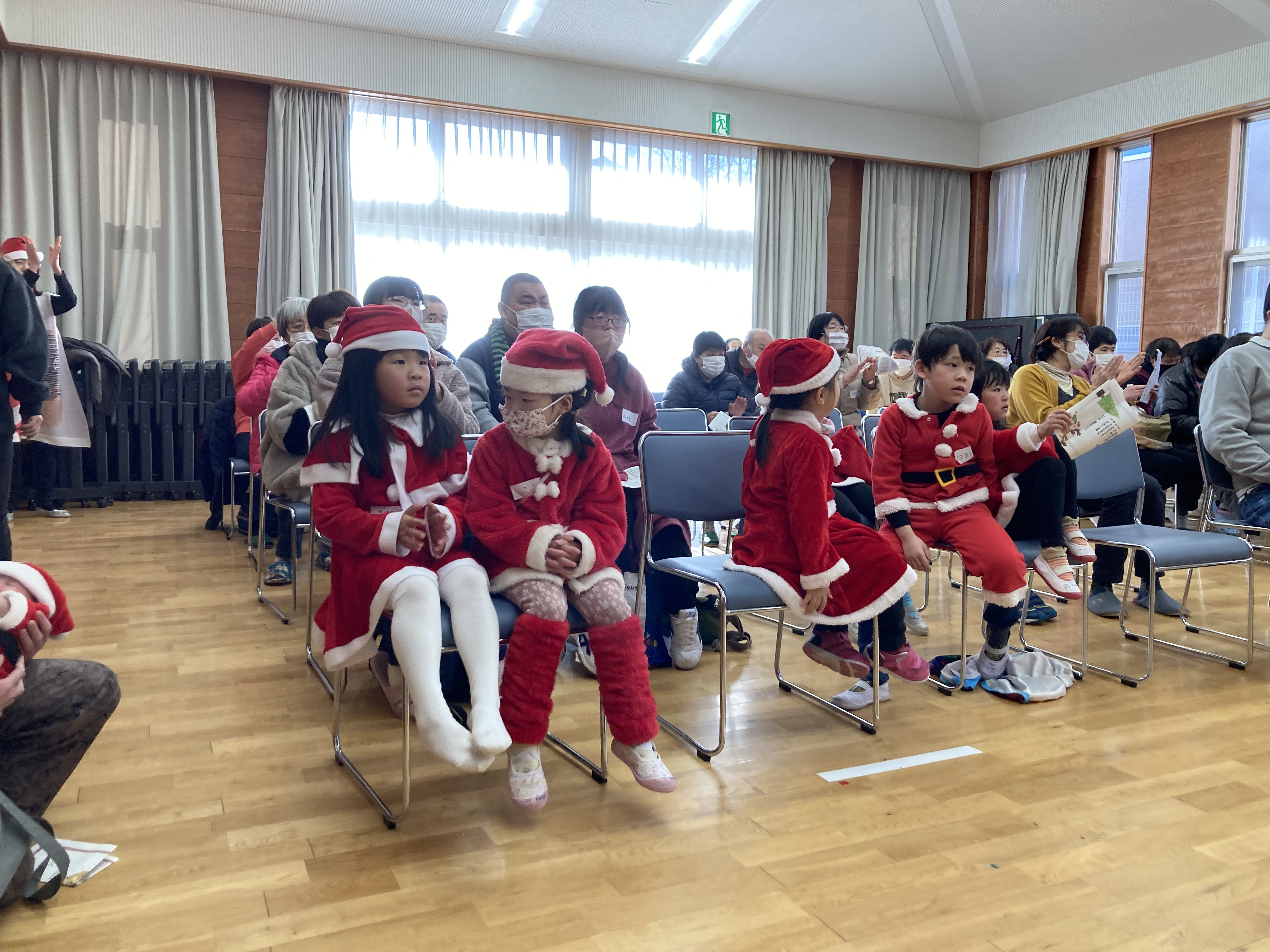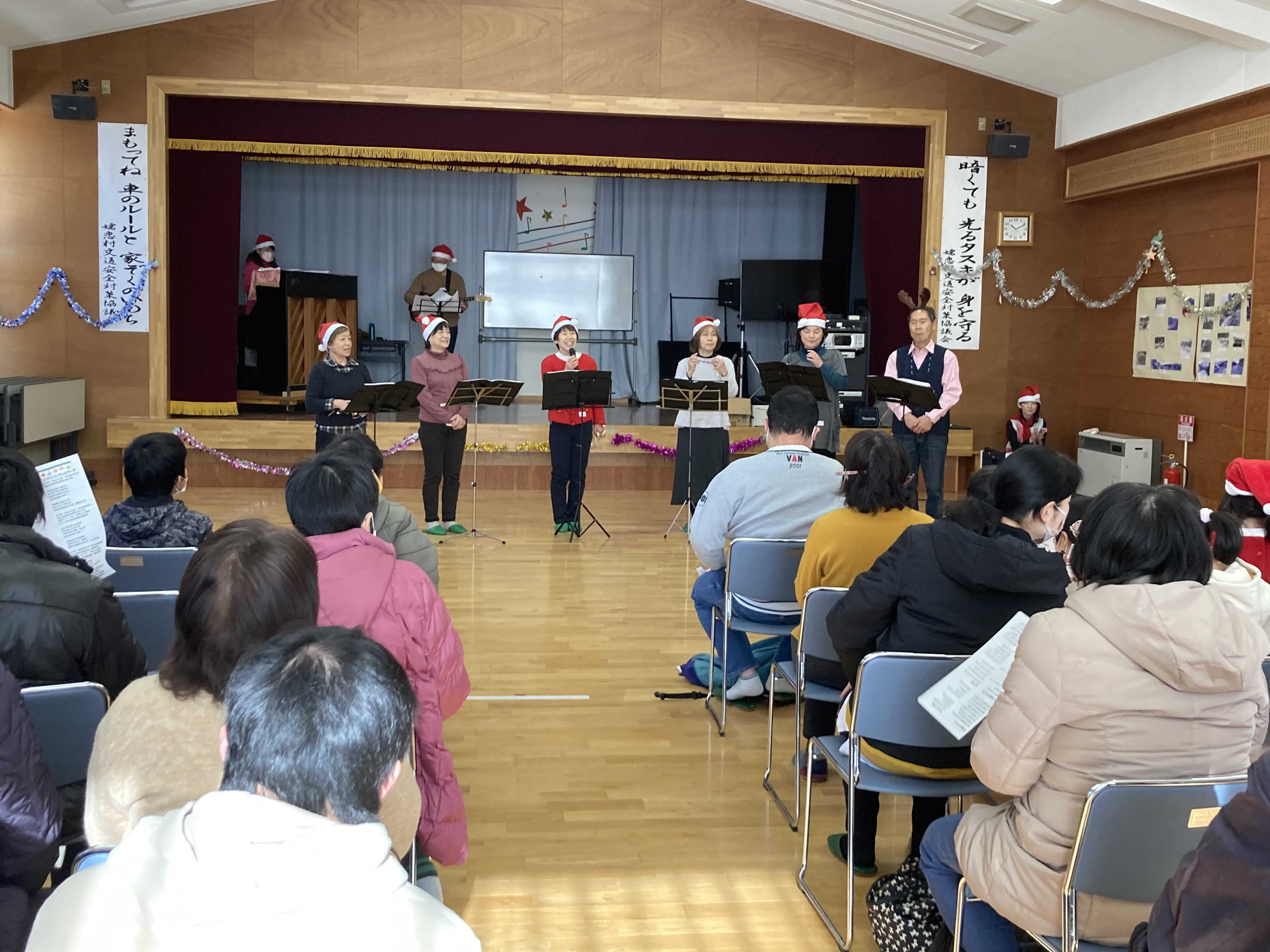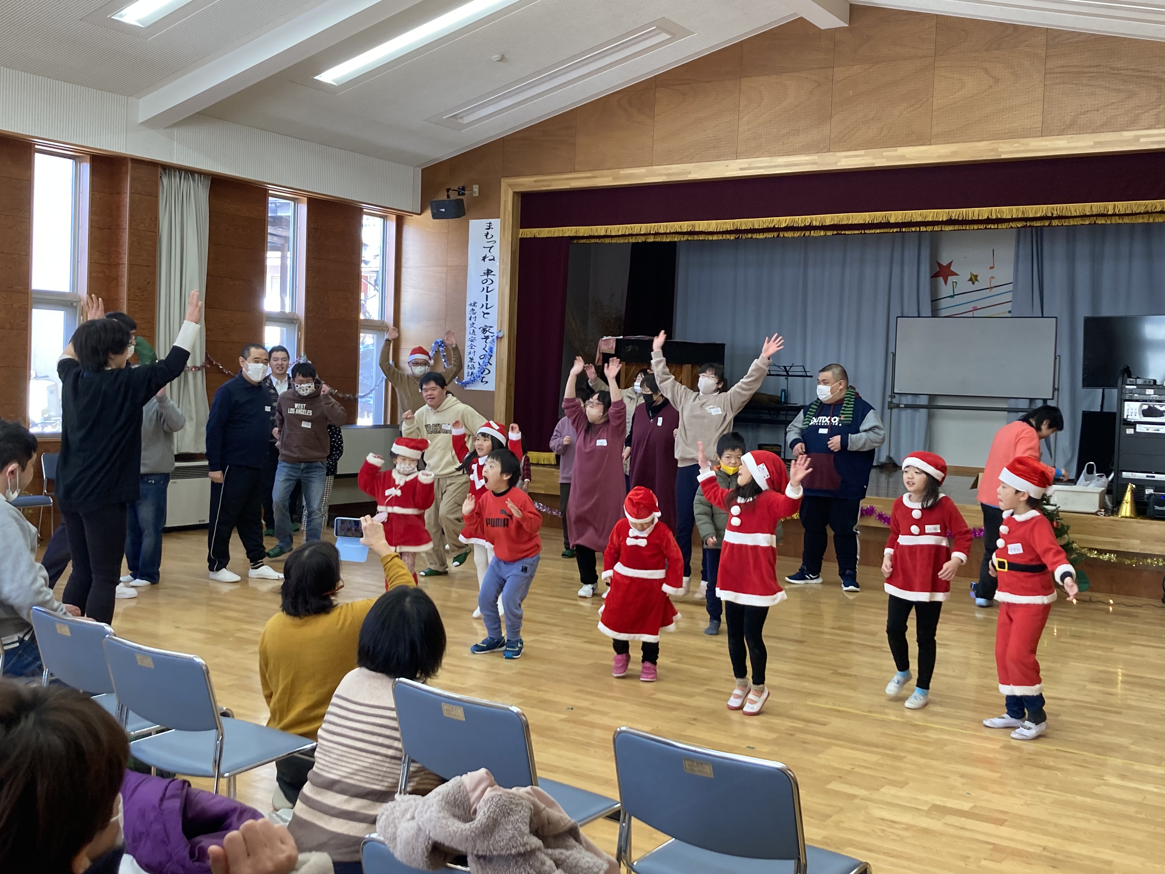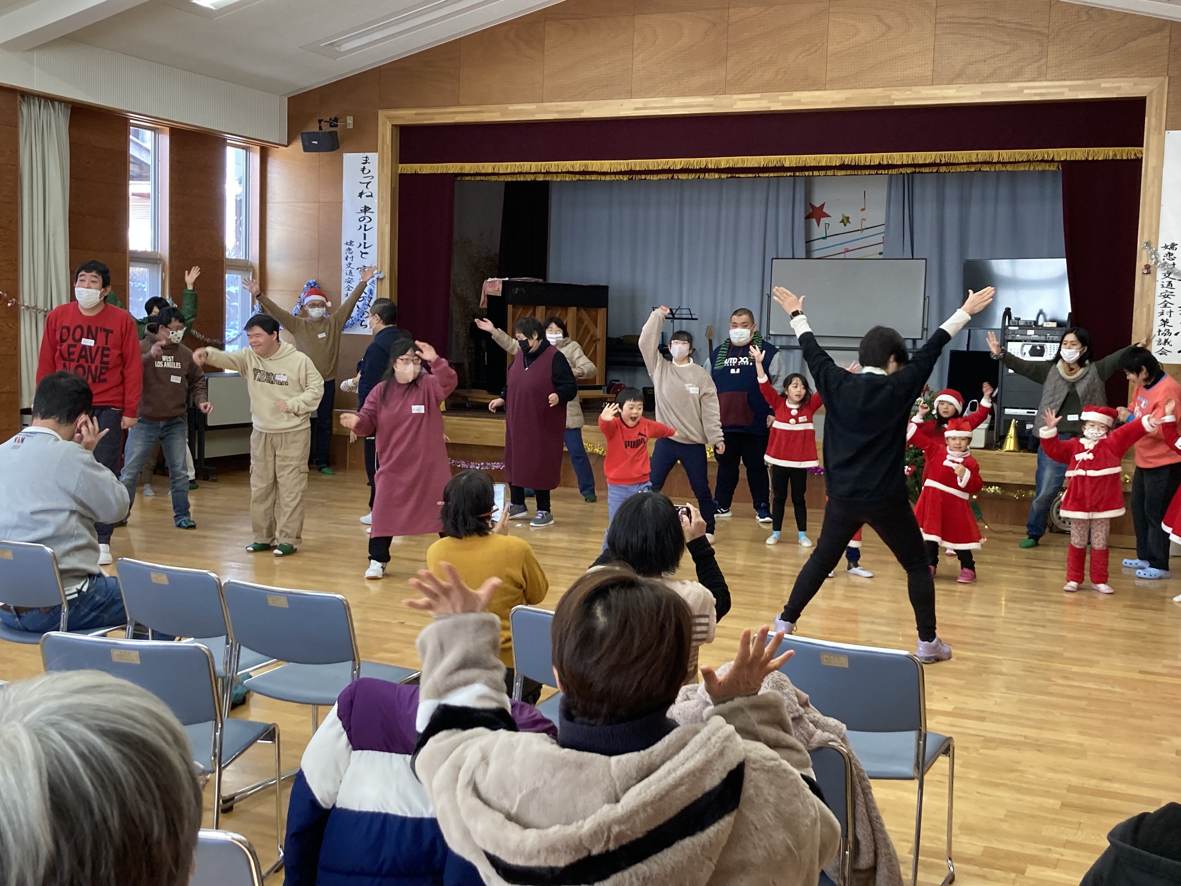 12月23日(土)、大前活性化センターにて、長野原町社会福祉協議会、草津町社会福祉協議会、嬬恋村社会福祉協議会、嬬恋村手をつなぐ育成会の共催で、なかよしクラブのクリスマス会が行われ、79名の方が参加されました。オカリナやギター、ピアノの演奏、ダンス・ダンス・ダンスの発表、パネルシアター、クリスマスクイズ、プレゼント交換などたくさんの催し物が行われました。2時間と短い時間でしたが、楽しいクリスマス会になりました。