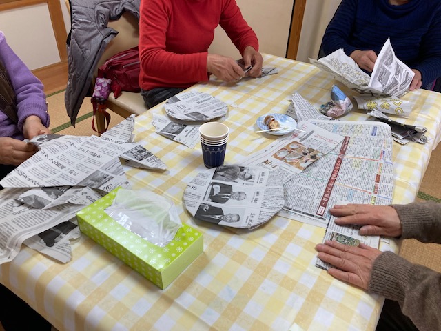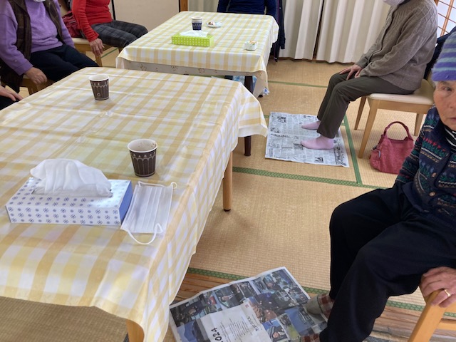 1月のほほ笑みカフェの様子です。今回は「新聞紙を使ってレクリエーション」をしました。足だけを使って新聞紙を折りたたんだり、丸めたり、また、手を使って○型や☆型を作りました。皆さん、試行錯誤をしながら新聞をちぎったり、折ったりして形を作っていきました。☆型は、皆さん苦戦するなか、とても上手に作れた方もいらっしゃいました。ほほ笑みカフェは、毎月第3金曜日に行っています。お気軽にお立ち寄りください。