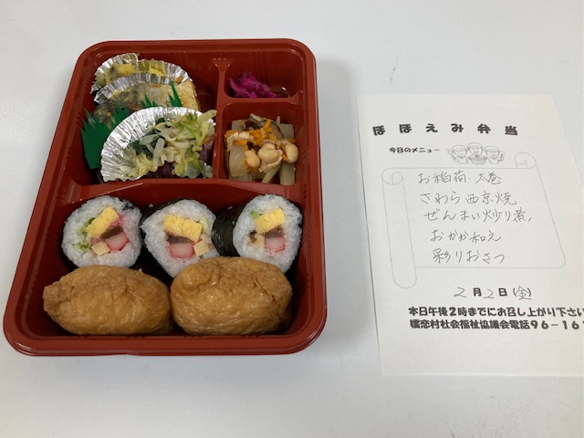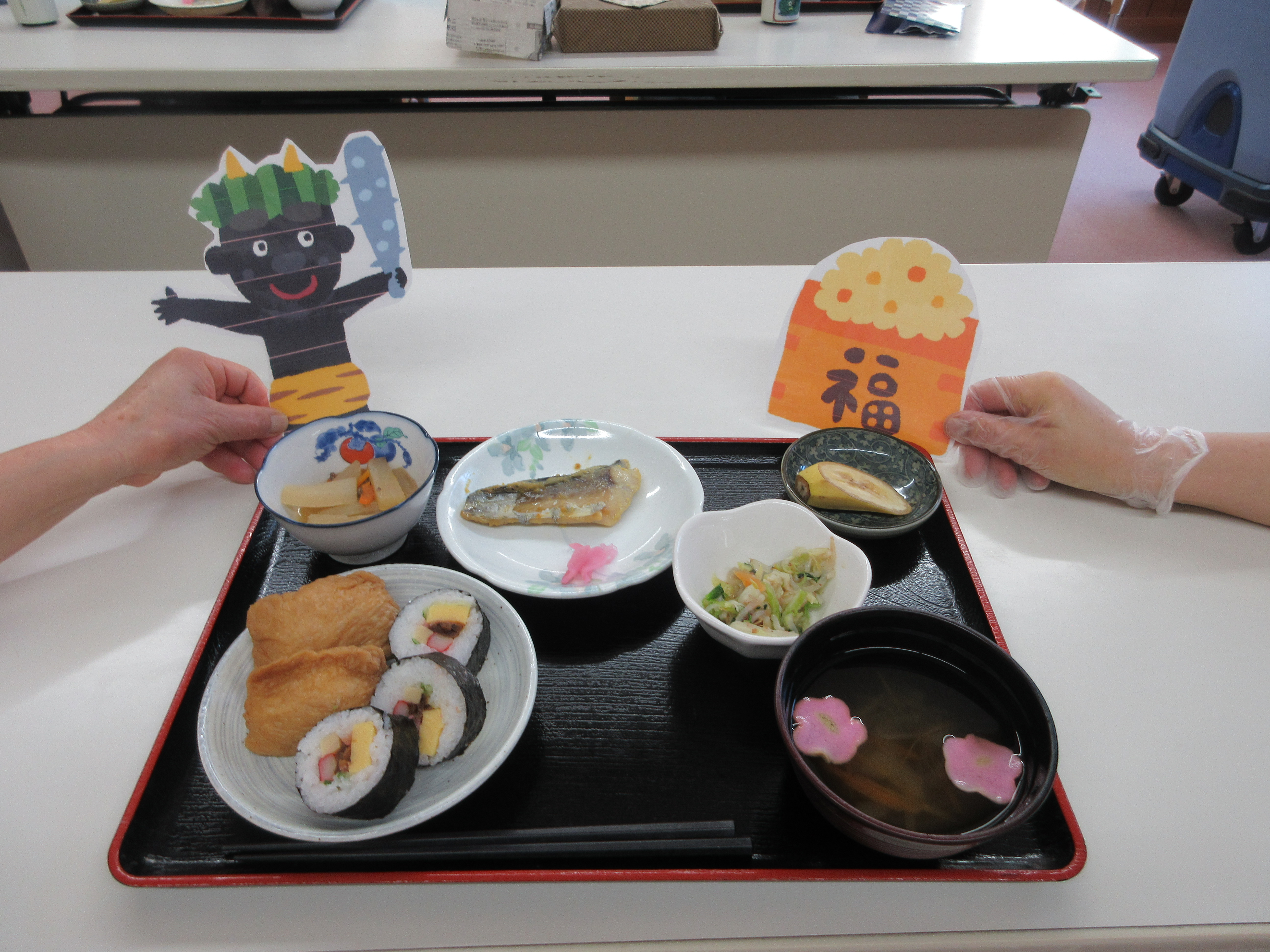 調理部では、節分にあわせて、太巻きと稲荷ずしの配食弁当と、デイサービスの昼食をお出ししました。季節やイベントに合わせた食事は、ご利用者様に大変喜んでいただいております。