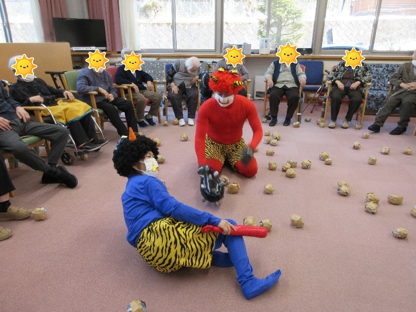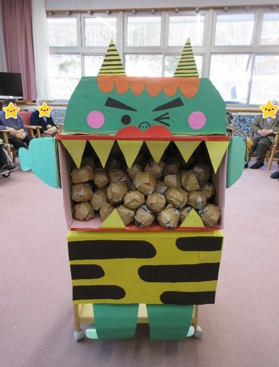 2月2日、3日豆まき、鬼退治を行いました。新聞紙を丸めた豆を作り赤鬼、青鬼を退治しました。皆さんに福が来ると良いですね。