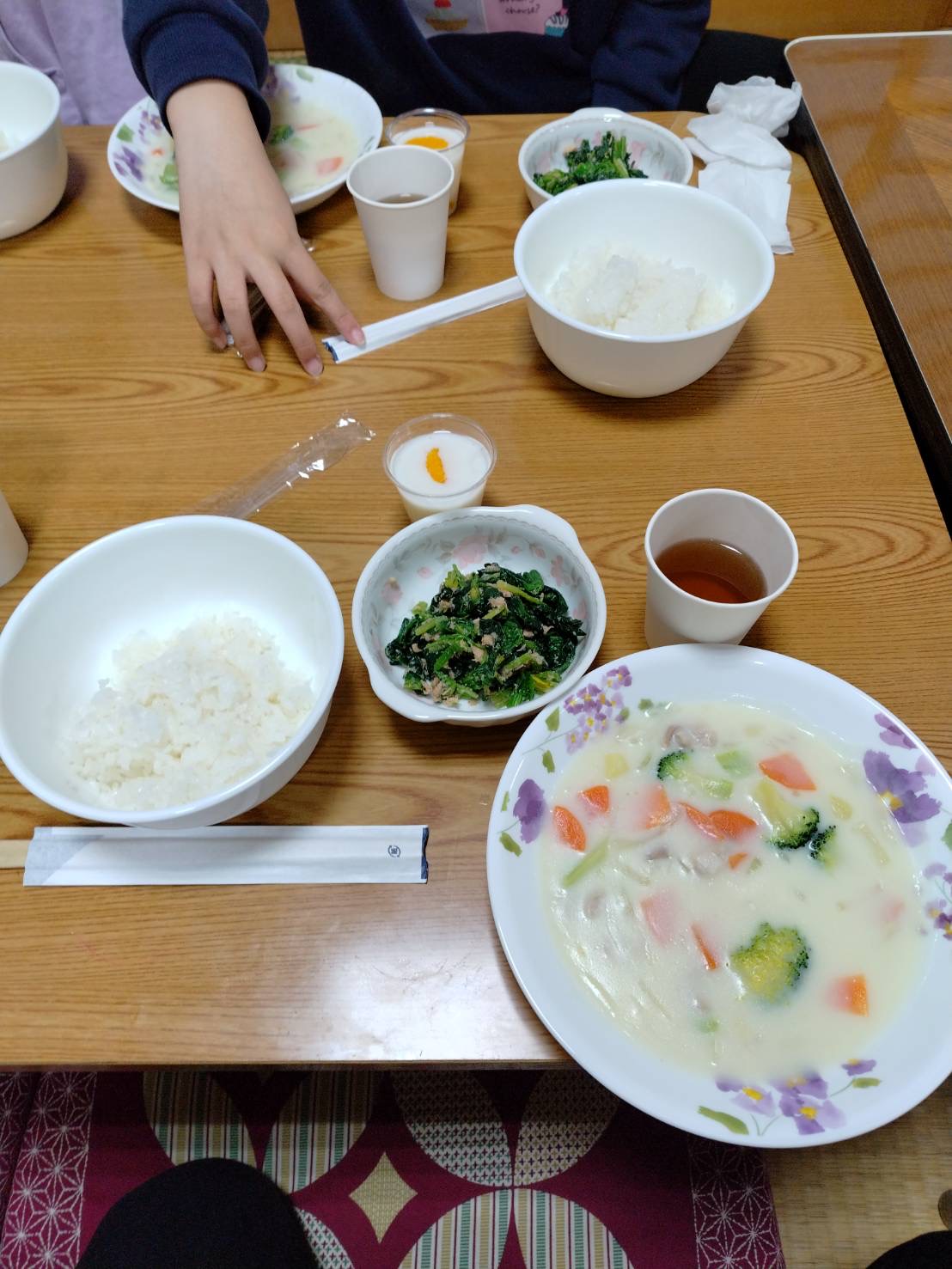 <メニュー:リクエストに応えてクリームシチュー、ご飯、ほうれん草とツナのゴマ和え、