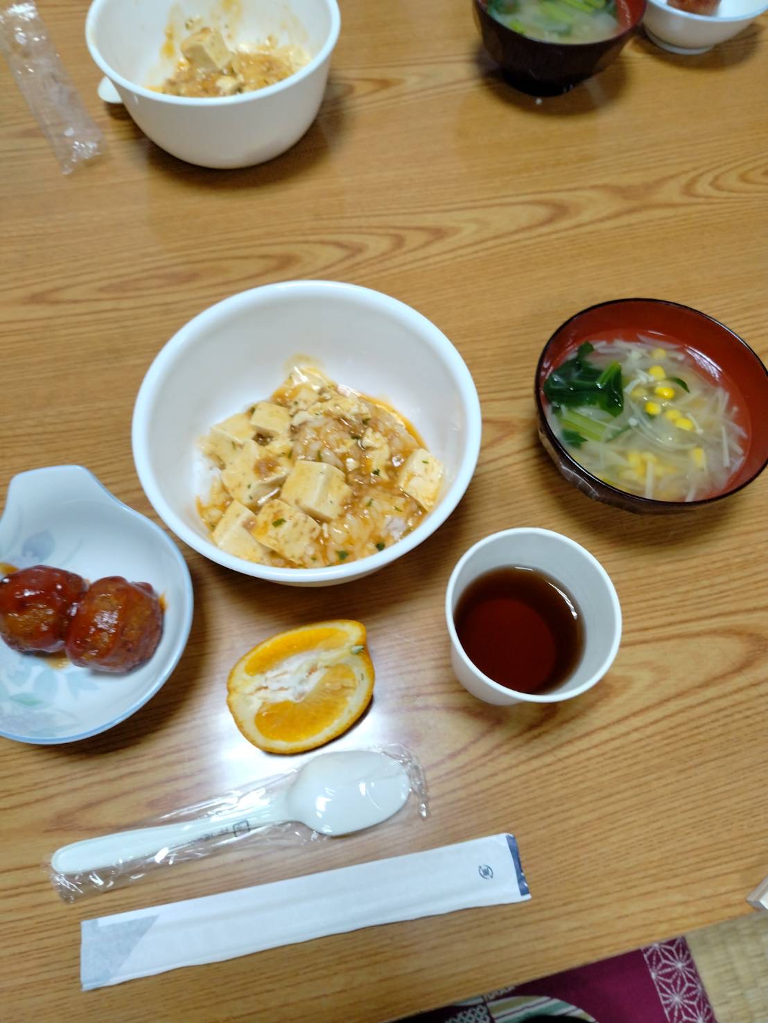 <メニュー:麻婆豆腐丼、野菜たっぷり中華風スープ、肉団子、オレンジ>