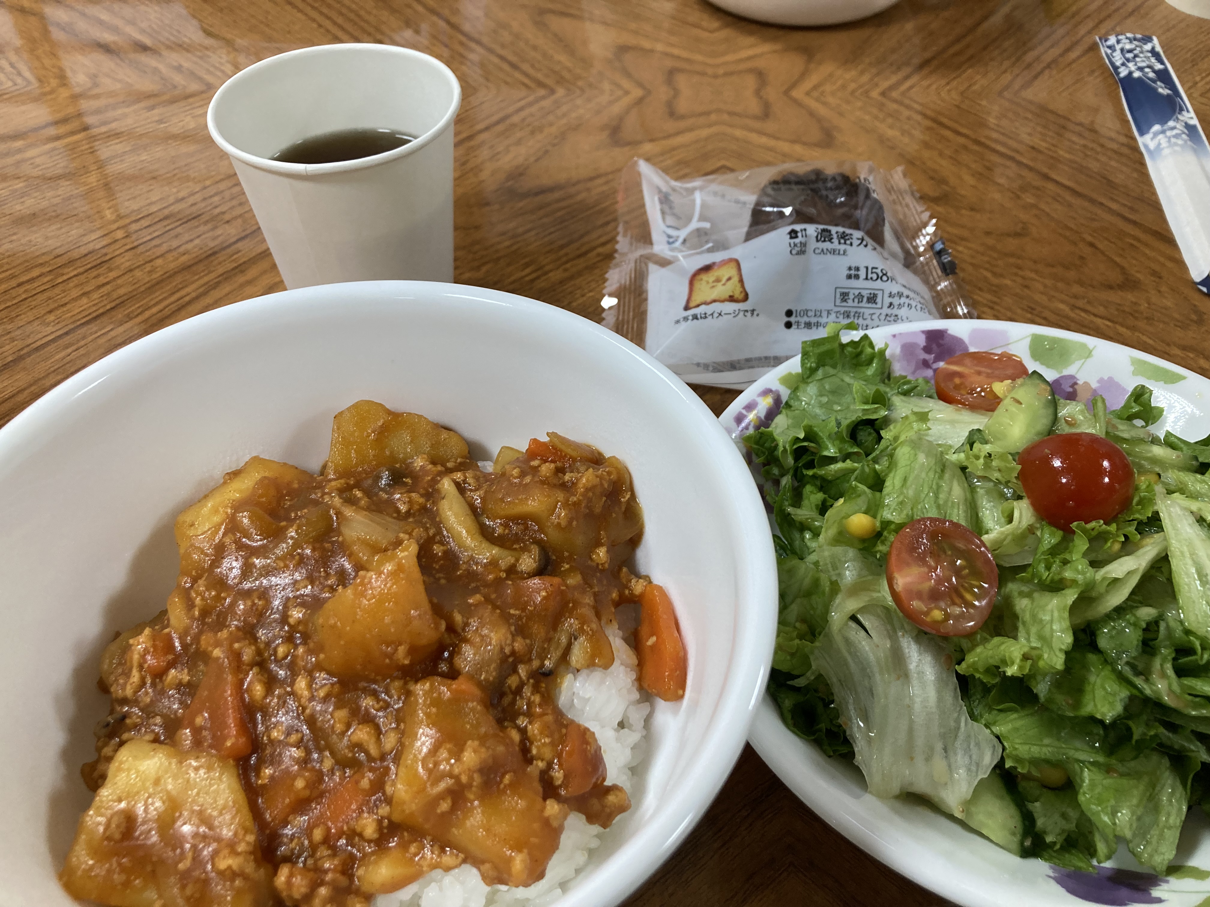 <メニュー:水食特製ハヤシライス、サラダ、選べるデザート>