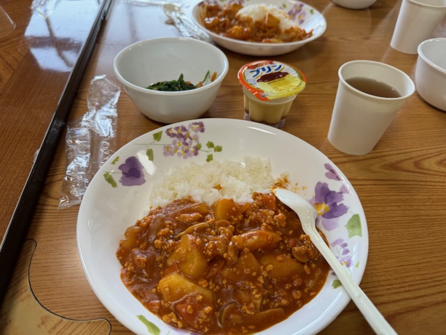 <メニュー:水食特製ハヤシライス、ほうれん草をツナのゴマ和え、プリン>