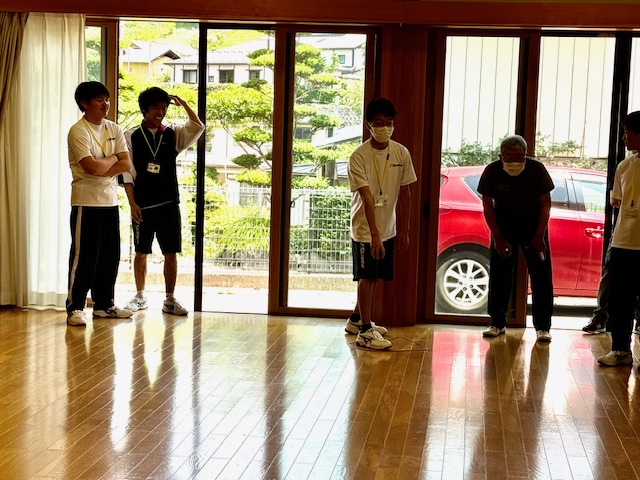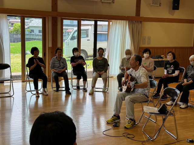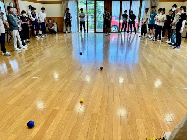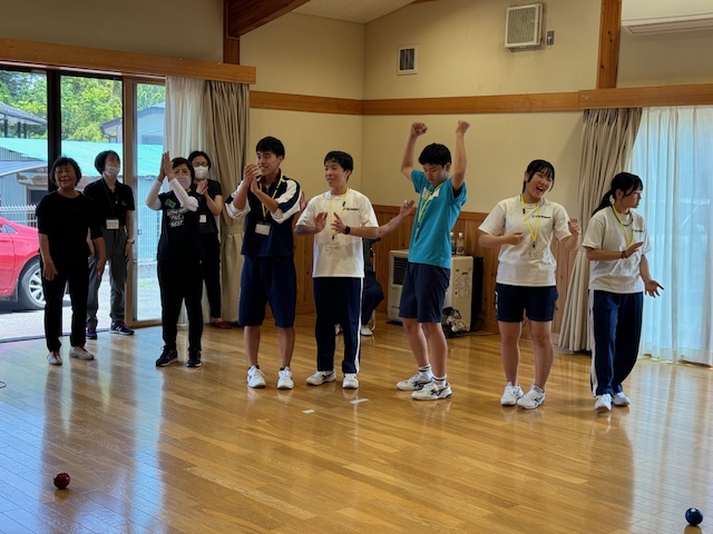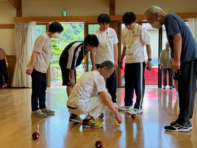 嬬恋高等学校の生徒と芦生田地区で行われている『わっきゃない教室(フレイル予防教室)』の方々との、地域学習の後半戦は、みんな大好きペタンク対決です。生徒と高齢者の混合チームで行いました。白熱した戦いが繰り広げられました。最後に、芦生田のシンガーソングライターによるギターと歌の演奏が行われ、みんなで一緒に歌を歌って終了となりました。地域学習で地域の高齢者との交流は初めての試みのようでしたが、お互いに尊重し合いながら、楽しく交流ができました。少しでも地域や地域にいる高齢者について考えてもらえるきっかけになれればと思います。個人的には、ずっとしたかった世代間交流としてのペタンクが行えて嬉しかったです。