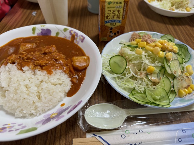 <メニュー:ハヤシライス、魔法のスライサーでスライスしたふわふわキャベツのサラダ、バナナ>