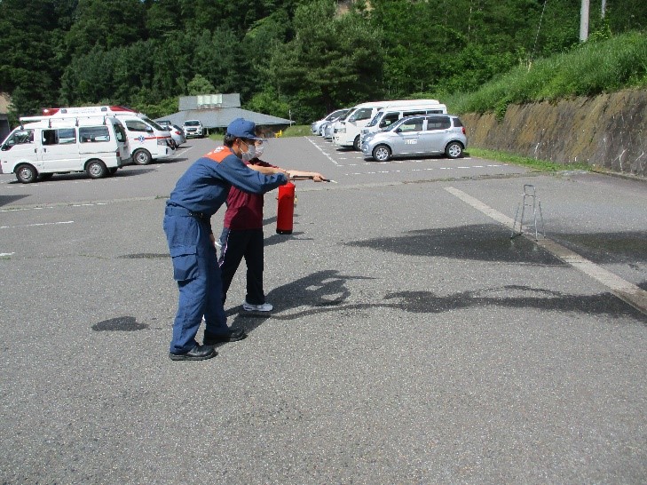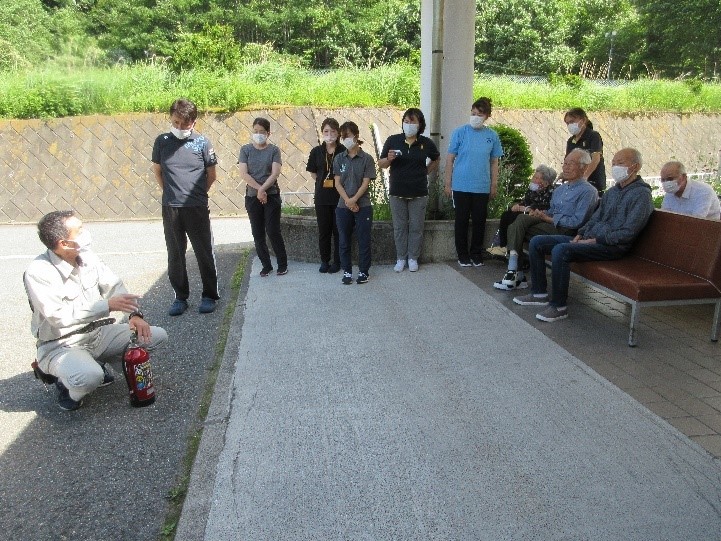 6月26日に避難訓練が行われました。広域消防嬬恋分署、共和消防設備さんの指導の下、避難訓練を行いました。消火器の使用方法等を詳しく教えていただきました。デイサービスに常備されている消火器は粉末消火器で中に細かい粉末が入っているタイプの物でした。消火器には使用できる火事の種類が記載されています。写真左下の3つの丸がありますが、上から白は普通火災、黄色は油火災、最後の青は電気火災とのことでした。電気火災が付いていない消火器で、電気火災に使用した場合は感電してしまうと言われていました。