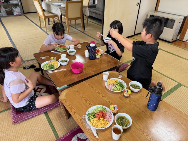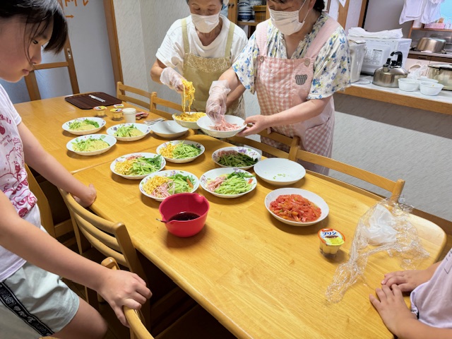 今回は初めての冷やし中華にしてみました!子供たちは大喜び。冷やし中華のタレは、圧倒的にお醤油味が人気です。たくさん食べたいという事で、麺も、野菜もたっぷり。ちなみに今回の野菜はすべてボランティアさんのご自宅で採れた野菜です。とれたてなので、とても美味しかったです。ごちそうさまでした。