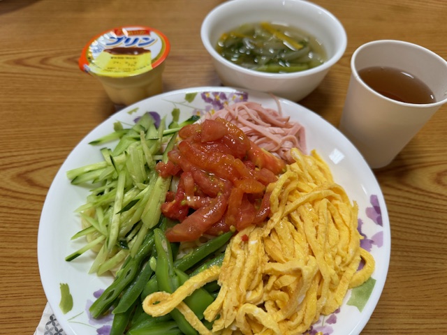 <メニュー:冷やし中華、野菜たっぷりスープ、プリン>