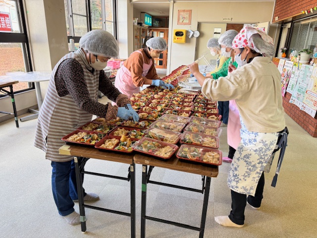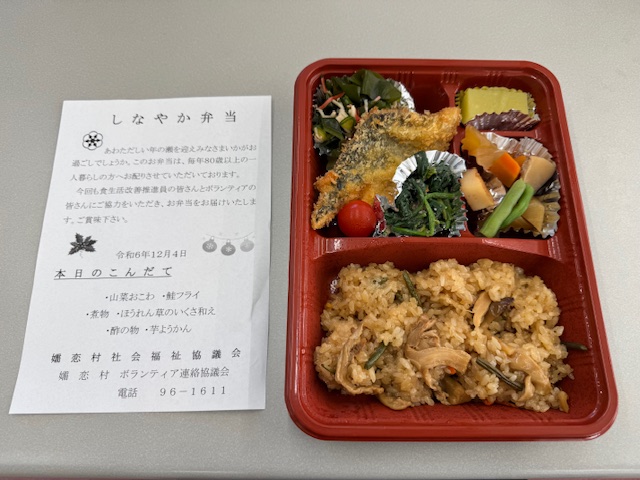 12月4日に、今年度第2回目の80歳以上一人暮らしの方への配食サービスが行われました。今回は124食を食生活改善推進委員の皆さんにお弁当を作っていただき、ボランティアの方にお届けをしていただきました。今年度は、のこり3月の1回となります。お楽しみにお待ちください。