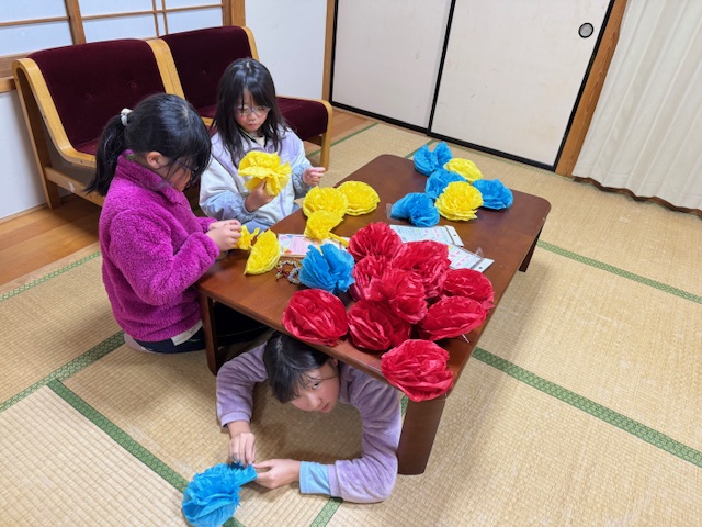 12月11日みんなの水曜食堂の様子です。参加者14名でした。今回は三原地区ふれあい・いきいきサロン「三原お茶飲み会」の方が、次回のサロン時に使うクリスマスの飾りを子供たちに作って欲しいとお越しになりました。子供たちは、ボランティアの方に教わりながらモールの飾りやお花を喜んで作っていました。三原地区の方も喜んでいただけると嬉しいです。今回のメニューはカレーライスです。チーズを買い忘れてしまい子供たちがすねていました。