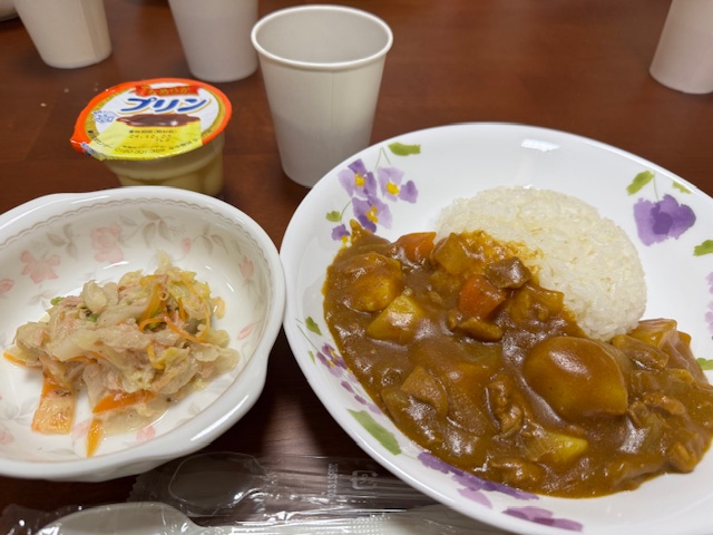 <メニュー:カレーライス、白菜サラダ、プリン>
