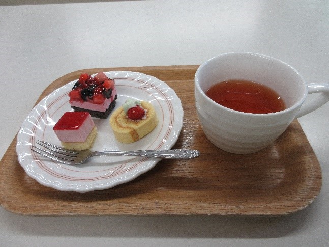 クリスマスメニュー、おやつのケーキも美味しそうです。サンタさんも来てくれました。