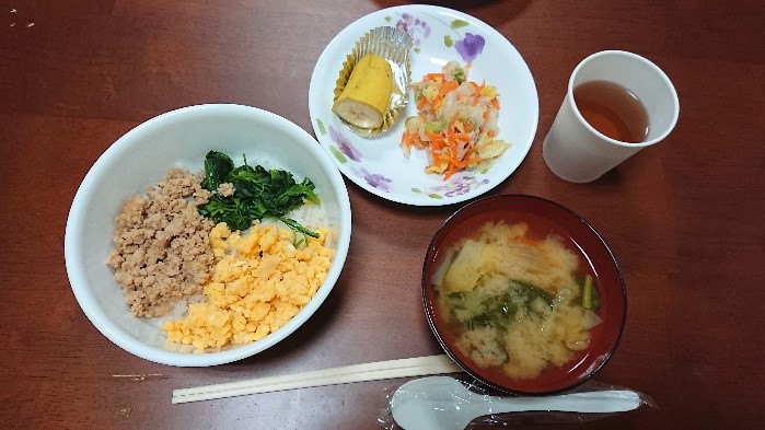 <メニュー:三色丼、白菜サラダ、みそ汁、バナナ>
