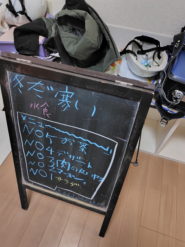 看板には寒いと書いてありますが、寒気も去り今日は比較的暖かいからなのか、こどもたちは来るやいなや、上着を放り投げて外に出て行きました。みんな、相変わらず元気ですね。暗くなってからは、センターの中でそれぞれ遊びました。