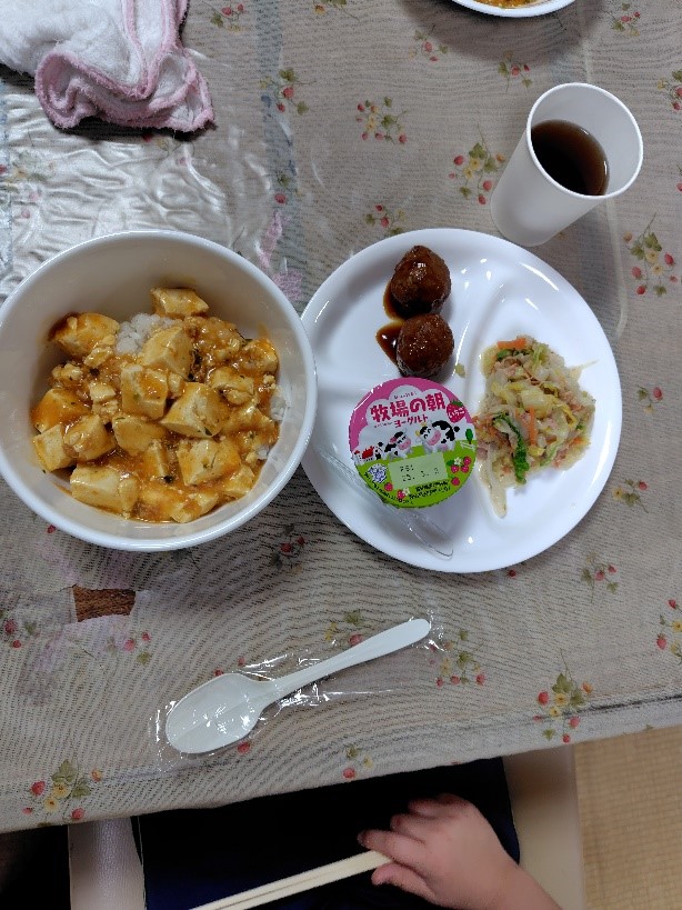<26日メニュー:麻婆豆腐丼、肉団子、サラダ、ヨーグルト>
