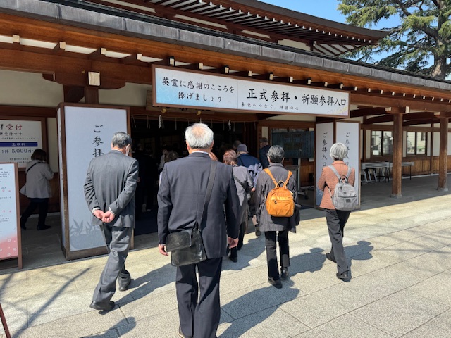3月22日(土)、嬬恋村遺族会と事務局30名で靖国神社へ正式参拝を行ってきました。靖国神社へ到着し歩いている時に、遺族会の方よりご家族を亡くされたお話なども伺いことができました。戦争で散ったご先祖様の国を思う想いや、戦争について考え、後世に伝えていくことが重要だと改めて感じました。