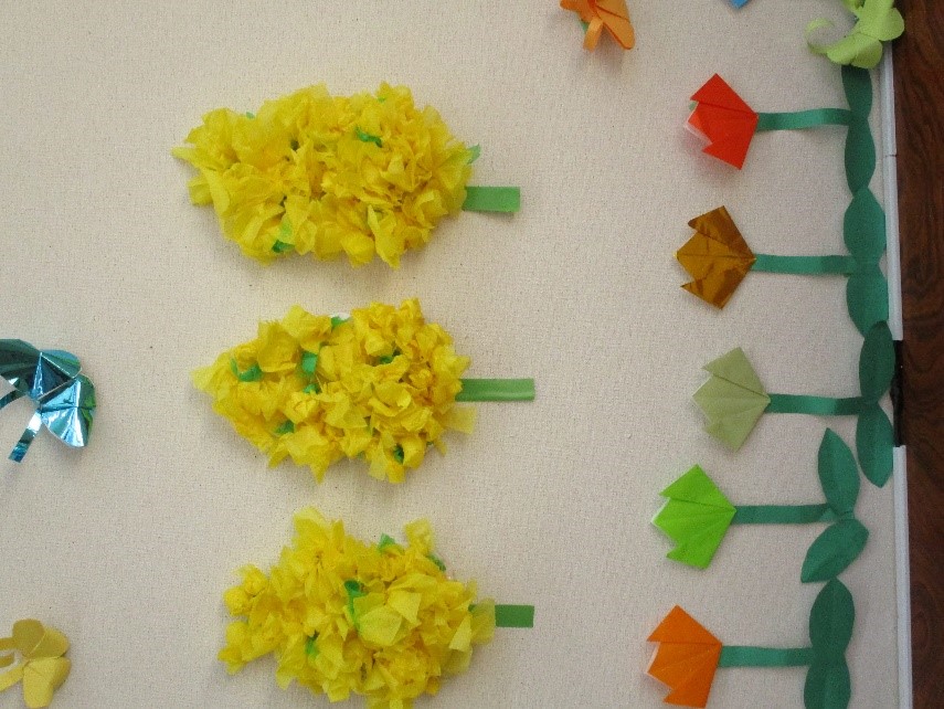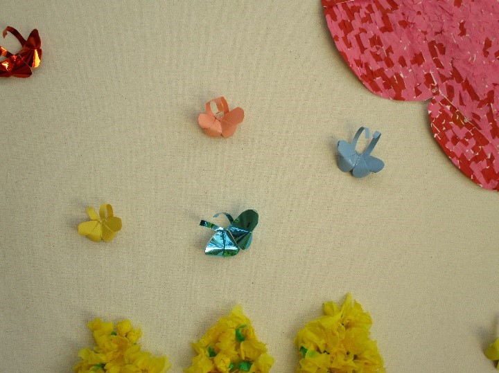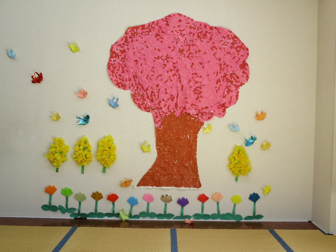壁画が春になりました。利用者様が千切って貼ってくれました。