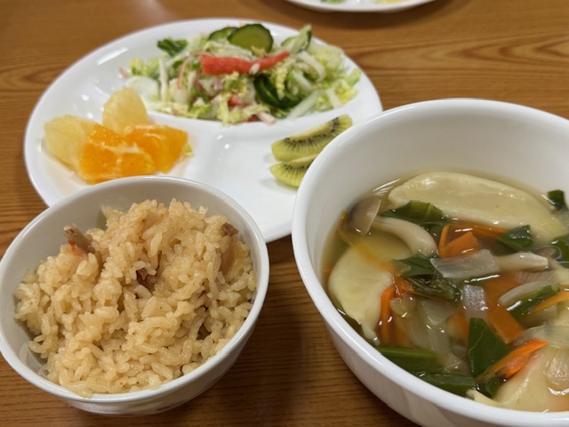 <メニュー:炊き込みご飯、餃子スープ、サラダ、フルーツ>