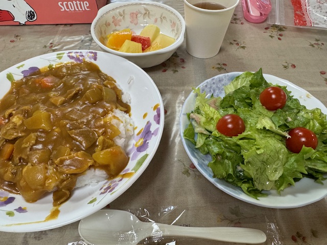 <メニュー:チーズカレーライス、サラダ、フルーツ>
