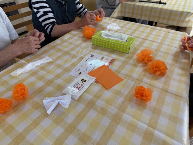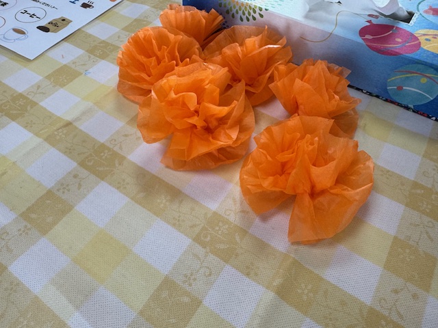 7月のほほ笑みカフェの様子です。今回は9月の認知症月間に向けて、ロバ隊長の創作を行いました。オレンジ色のお花紙でお花を作り、ロバ隊長を着飾っていく予定です。皆さんでたくさんのお花を作りましたが、着飾るのはまだまだ足りませんので、来月も引き続き行う予定です。ほほ笑みカフェは、毎月第3金曜日に行っています。お気軽にお立ち寄りください。